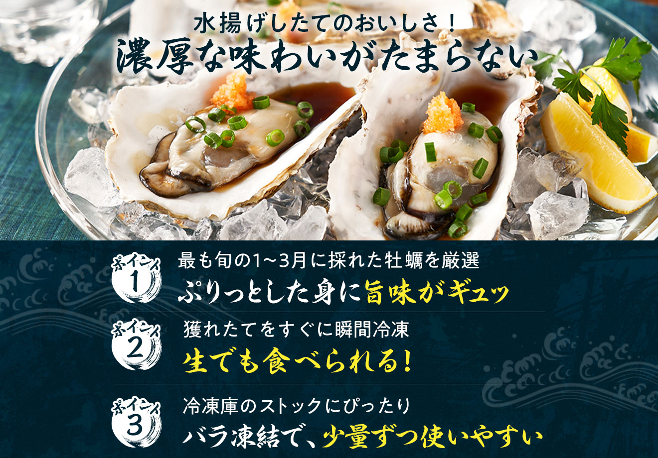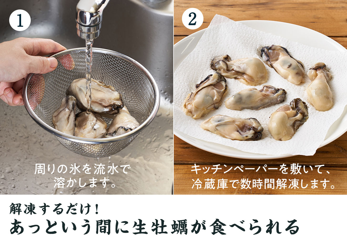 ふとした時に食べたくなる牡蠣。一粒ずつ凍結されているので、サッと解凍して使えて便利!自然解凍でも流水解凍でも、旨味そのままおいしく解凍できます。一度買うと使い勝手の良さにやみつきに、冷凍庫の常備品になること間違いなし!