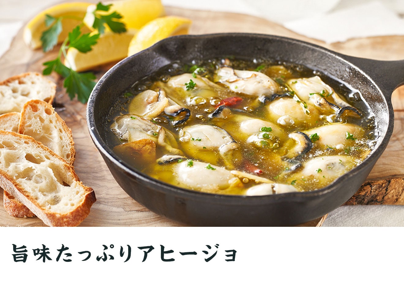 解凍した牡蠣をオリーブオイルに入れてじっくり加熱するだけで、簡単アヒージョに。よりクリーミーな食感を楽しめる、お酒も進む味わいです。