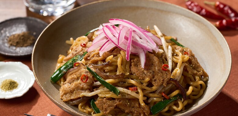 唐辛子と2種の山椒を使った香り豊かな麻辣焼きそば。にんにくの効いた特製だれと醤油ベースのオイスター風が野菜の旨みを引き出します。ピクルスをのせて食べるのがおすすめ!
