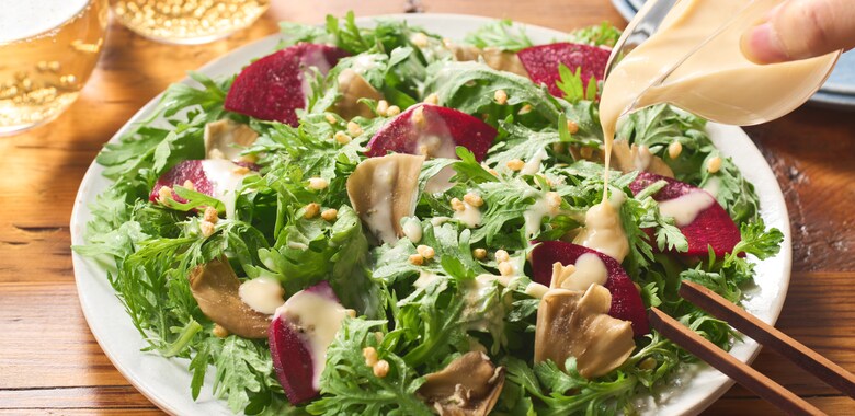 ドレッシングに白味噌とソイマヨを混ぜることで、コクや風味がアップします。