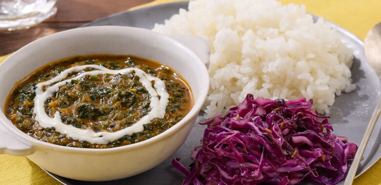 ミキサーを使わずに作れる、山盛りのほうれん草を使ったサグカレー。特製ミックススパイスでかんたんに本格的な味わいを演出します。クミンの香り広がる副菜と合わせて、いつもと違う食卓をお楽しみください。