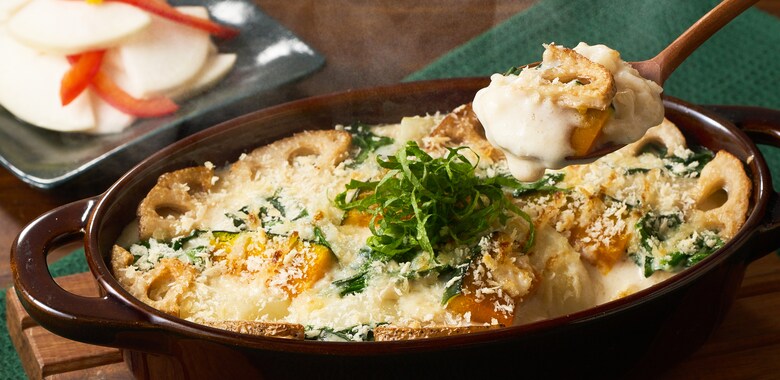水分でとろりとするスライスもちを活かし、和風だしや味噌で味付けしたアレンジドリア。柚子の和え物を添えてさっぱりいただけるよう仕上げました。おなかも心も満たされる寒い日にぴったりのメニューです。